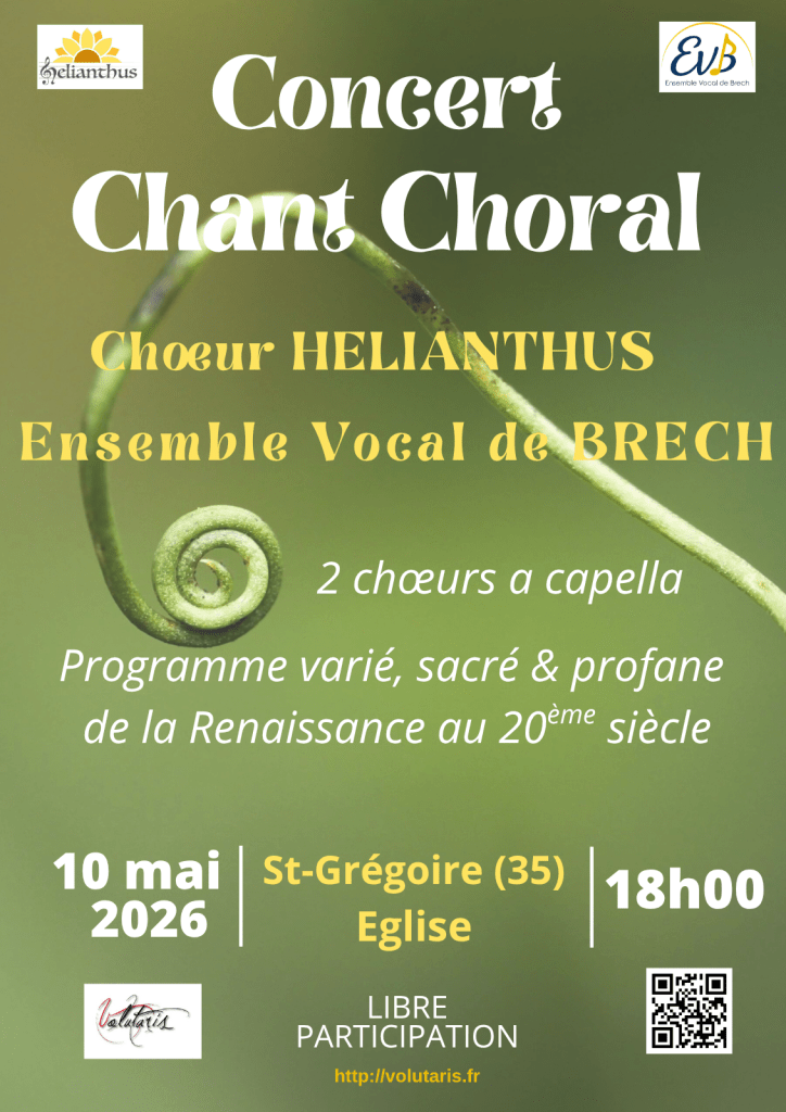Le chœur Helianthus et l’Ensemble Vocal de Brech donneront un concert ensemble le 10 mai 2026 à 18h à l’Eglise de Saint-Grégoire (35). La participation est libre.