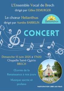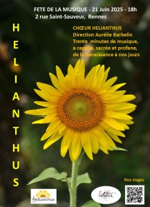 Comme chaque année, le Chœur Helianthus participera à la Fête de la Musique le 21 juin prochain. Aux environs du 2 rue Saint-Sauveur à Rennes à 18h, venez écouter le programme varié que le Chœur a constitué spécialement pour cette occasion ! - 2025-05 : Concert du Chœur Helianthus à Brech