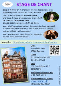 Du 26 au 28 août prochain, l’association Volutaris organise son 2e stage de chant lyrique à Rennes. Le stage se terminera par une audition publique le 28 août à 17h. Durant trois jours, vous bénéficierez d’un cours individuel de chant de 40 minutes, avec la participation active des autres stagiaires. Le stage est également ouvert aux duos (constitués ou non).Lire la suite « 2025-08 : Stage de chant à Rennes du 26 au 28 août » - 2025-06 : Fête de la Musique par le Chœur Helianthus