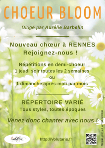 Vous êtes instrumentiste et depuis longtemps vous souhaitez découvrir votre voix ? Vous êtes chanteur soliste et vous souhaitez améliorer votre lecture de partition ? Vous êtes choriste et vous voulez vous perfectionner ou découvrir d’autres répertoires et manières de travailler ? Le chœur Bloom a été créé pour vous ! Venez nous rejoindre et partager vosLire la suite « 2025-09 : Création d’un nouveau chœur, le Chœur Bloom ! » - 2025-08 : Atelier d’initiation au chant choral sur Rennes le 29 août