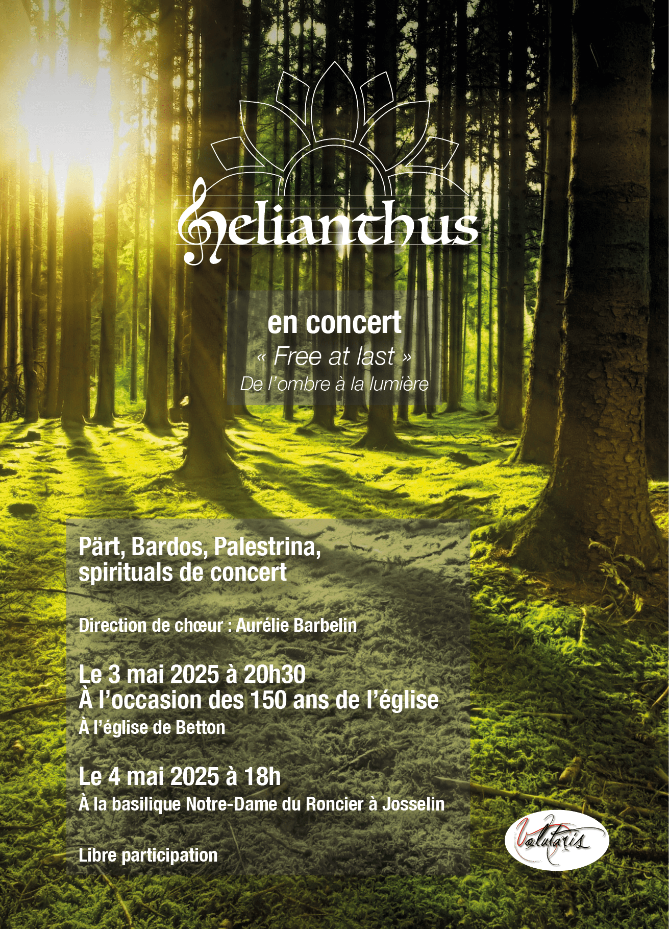 Le Chœur Helianthus se produira en octobre pour deux concerts du programme Free at Last : Le 11 octobre à 20h Eglise Saint-Laurent de Rennes (35) (ligne b, arrêt Gros-Chêne) Le 12 octobre à 16h Basilique Notre-Dame de Paradis à Hennebont (56) Vous pourrez entendre des œuvres de Pärt, Bardos, Palestrina ainsi que des spiritualsLire la suite « 2025-10 : Concerts d’octobre du Chœur Helianthus »