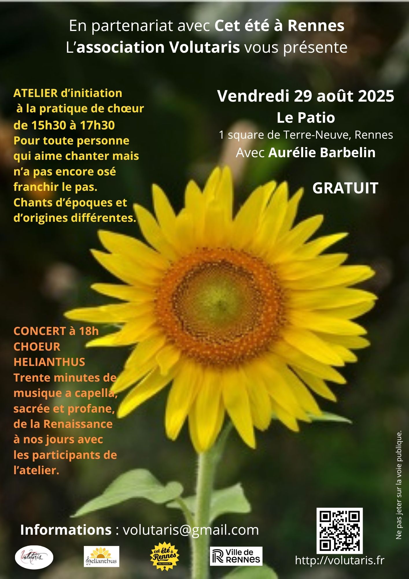 En partenariat avec Cet été à Rennes et la Ville de Rennes, l’association Volutaris vous propose un atelier de chant choral le vendredi 29 août de 15h30 à 17h30. Vous avez toujours aimé chanter sans oser vous lancer en chœur ? Cet atelier est fait pour vous ! En compagnie d’Aurélie Barbelin, cheffe de chœur,Lire la suite « 2025-08 : Atelier d’initiation au chant choral sur Rennes le 29 août »