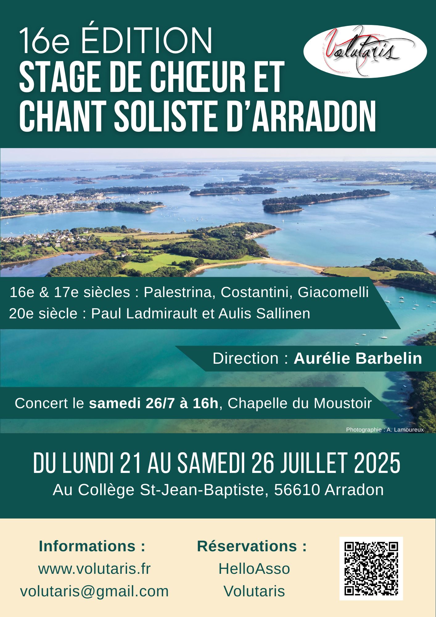 La 16e édition du Stage de choeur et de chant soliste d’Arradon aura lieu du lundi 21 au samedi 26 juillet 2025 au Collège Saint-Jean-Baptiste d’Arradon. Venez passer un moment convivial et musical à deux pas de la mer du Morbihan ! Vous retrouverez toutes les infos nécessaires sur notre page dédiée : Stage d’ArradonLire la suite « 2025-07 : Stage de chant choral à Arradon du 21 au 26 juillet »