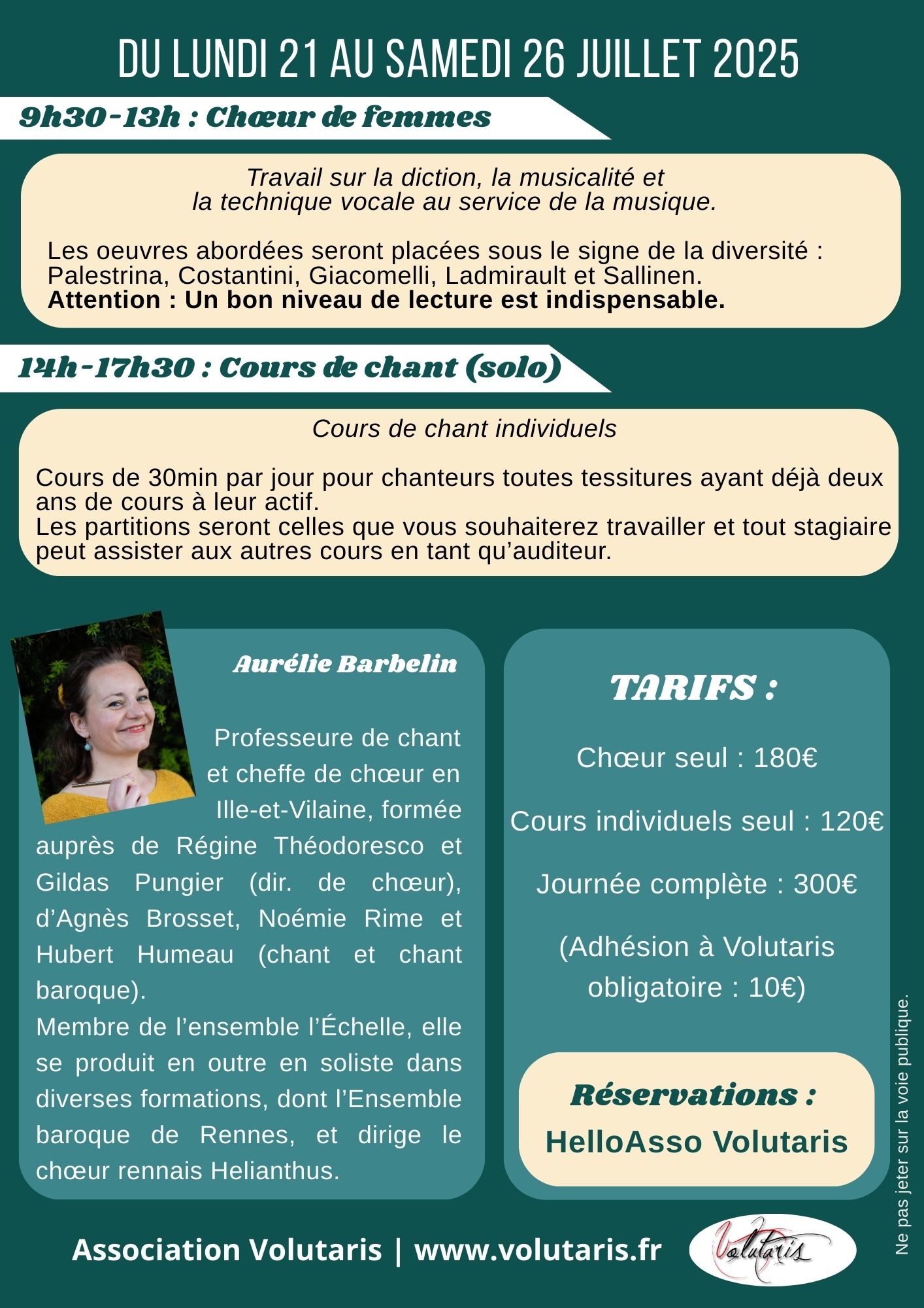 Du 21 au 26 juillet 2025, Volutaris et Aurélie Barbelin vous proposent de participer au 16e stage de choeur d’Arradon. A deux pas de la mer du Morbihan, venez passer un moment convivial et musical !