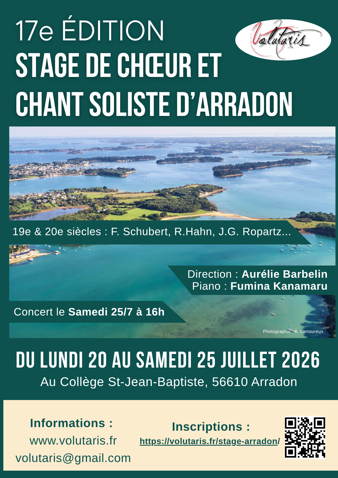Du 20 au 25 juillet 2026, Volutaris et Aurélie Barbelin vous proposent de participer au 17e stage de chœur d’Arradon. A deux pas de la mer du Morbihan, venez passer un moment convivial et musical !