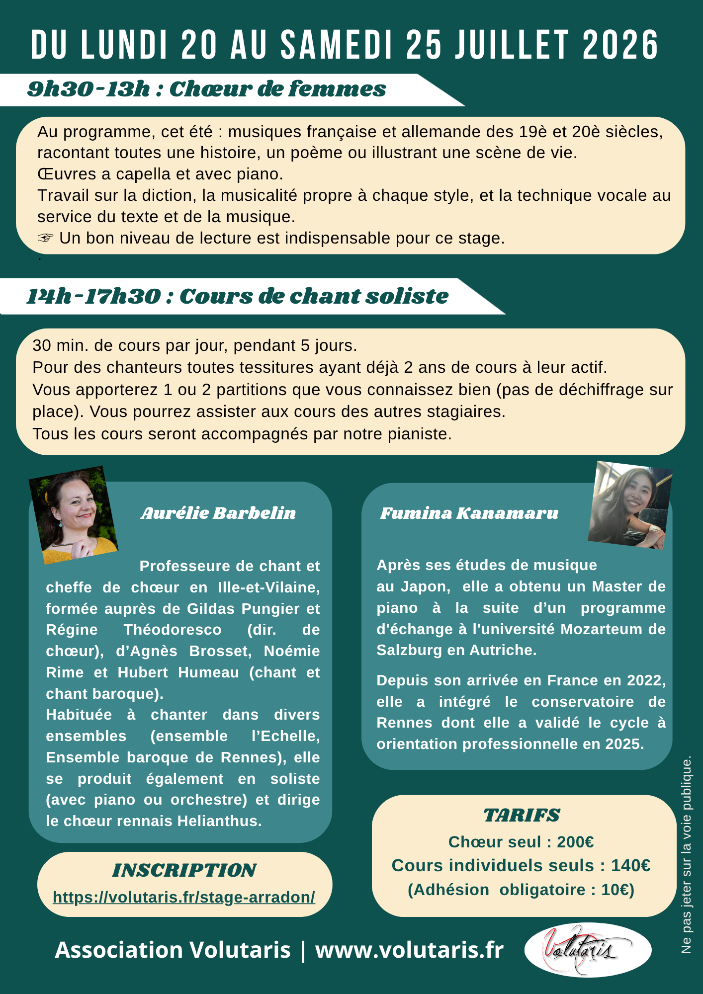 Les après-midis (14h-17h30) seront dédiées à des cours de chant individuels (30min par jour) pour des chanteurs toutes tessitures ayant déjà deux ans de cours à leur actif. Vous apporterez une ou deux partitions que vous connaissez bien (pas de déchiffrage sur place). Les autres stagiaires peuvent assister aux cours en tant qu’auditeurs.